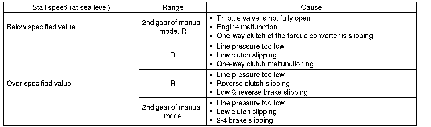 ^ If the stall speed is higher than the specified range, attempt to finish the stall test in as short a time as possible, in order to prevent the automatic transmission from sustaining damage.