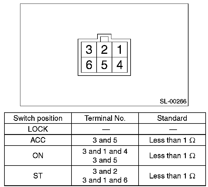 4. Turn the ignition key plate to each position and check the continuity between terminals of ignition connector.