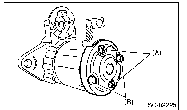 3. Remove screws (A) of the brush holder assembly, and through bolts (B) on both sides, and remove the starter cover assembly.