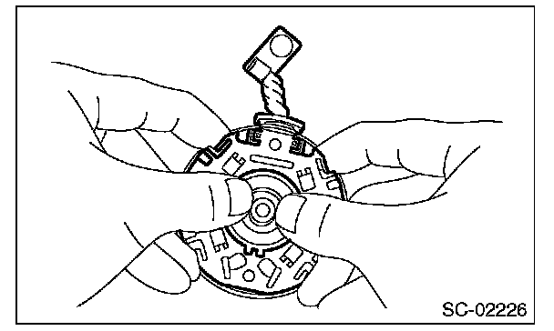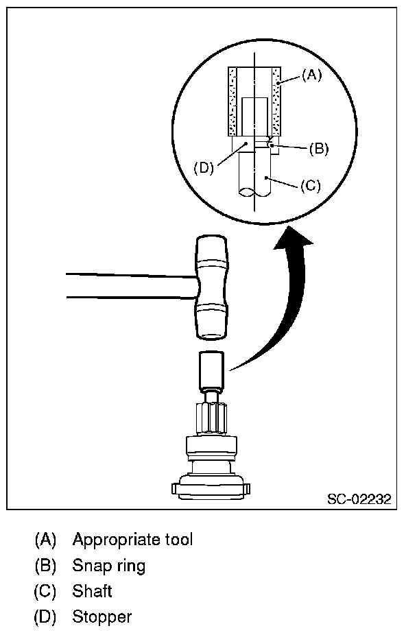 1. Use an appropriate tool (such as a fit socket wrench), and remove the stopper from snap ring by lightly tapping the stopper with a plastic hammer.