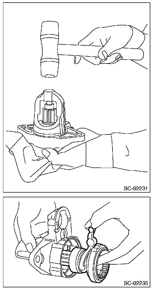 9. Lightly tap the starter housing assembly with a plastic hammer as shown in the figure, and remove the overrunning clutch, internal gear assembly, shaft and shift lever together as one unit.