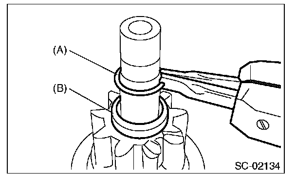 2. Remove snap ring (A) from the shaft, and remove stopper (B).