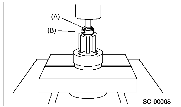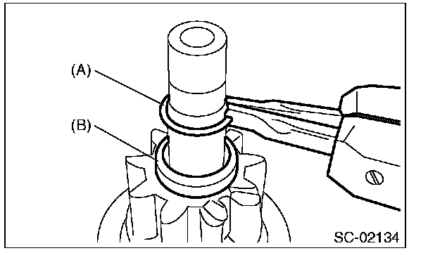 4. Using a press, pressure fit stopper (B) into snap ring (A).
