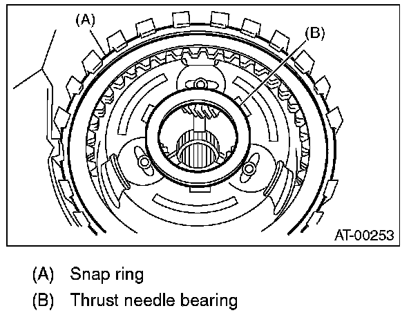 14) Remove the snap ring and thrust needle bearing.