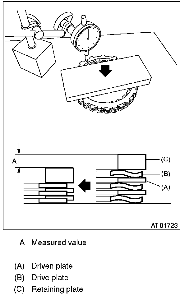 Calculate from the recorded dimension A and B, and if the service limit is exceeded, replace the drive plate with a new part, and select a retaining plate to make an adjustment so that it is within standard.
