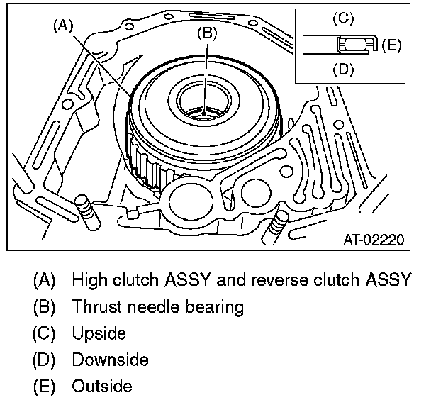 30) Apply Vaseline, and attach the thrust needle bearing to the high clutch hub, then engage the splines of the front planetary carrier correctly to install the high clutch hub.