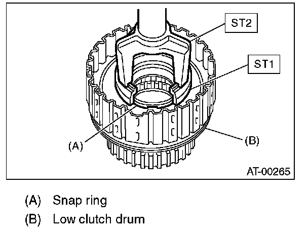 7) Compress the spring retainer of the low & reverse brake, and remove the snap ring from the low clutch drum using ST1 and ST2.