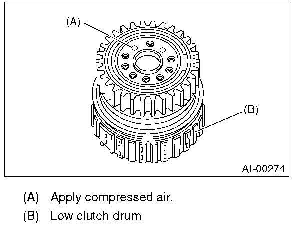 9) Install the one-way clutch inner race to the low clutch drum, and then apply compressed air to remove the low clutch piston.