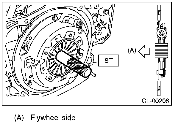 1) Insert the ST into the clutch disc and attach to the flywheel by inserting the ST end into pilot bearing.