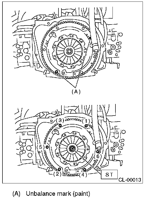 ^ When installing a clutch cover to the flywheel, position the clutch cover so that the spacing between the unbalance marks (paint mark) on the flywheel and clutch cover is 120° or more apart. (The unbalance mark indicates the direction of residual unbalance.)