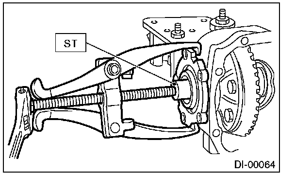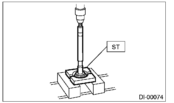 14) Press the end of drive pinion shaft and extract it together with rear bearing cone, pinion height adjusting washer and washer by using the ST.