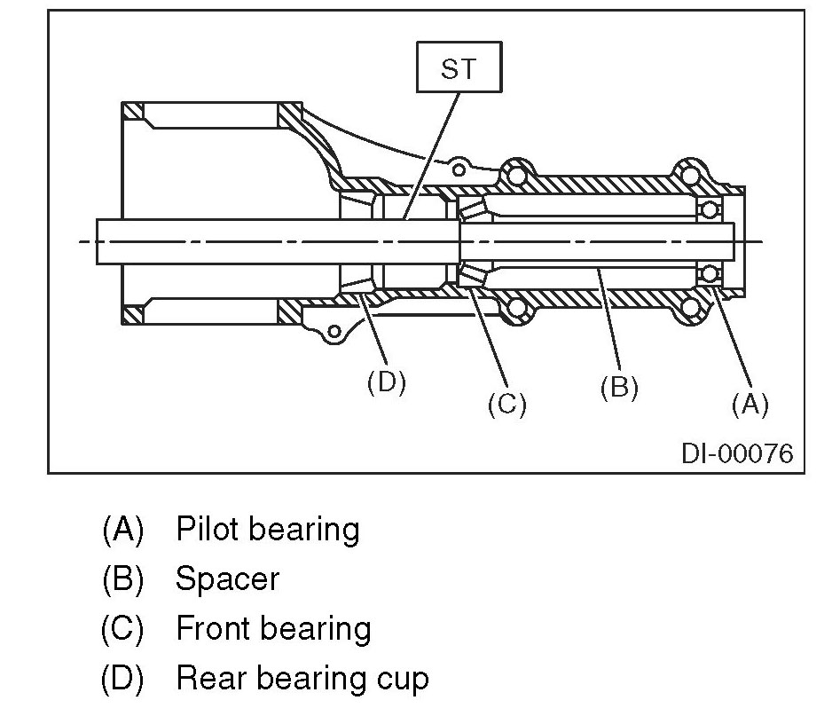 17) Remove the pilot bearing together with the front bearing cone and spacer using the ST.