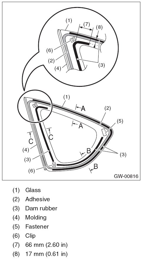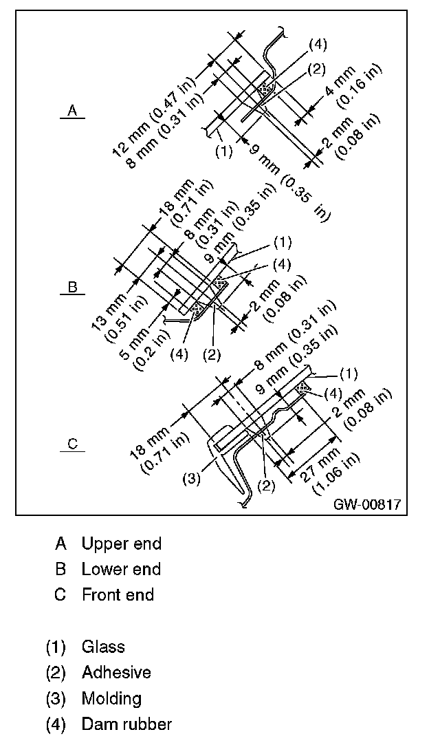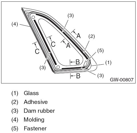 4. Apply adhesive with the dam rubber installed in the same procedure as for windshield glass.