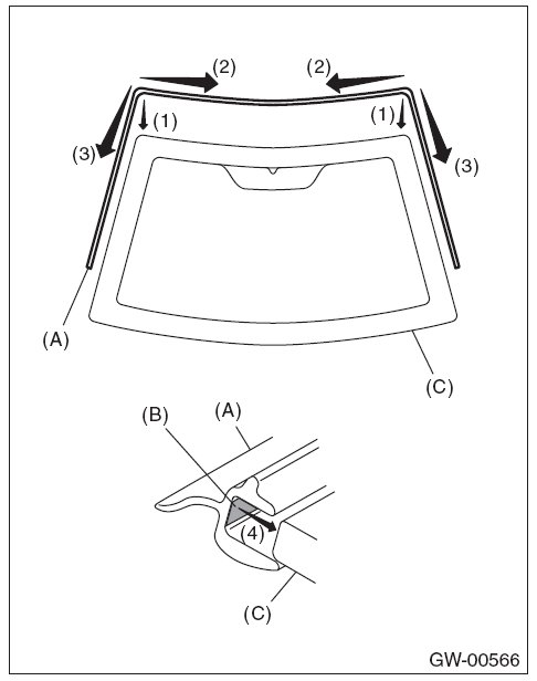 1. Align the molding (A) with both ends of the upper edge of the windshield glass (C).