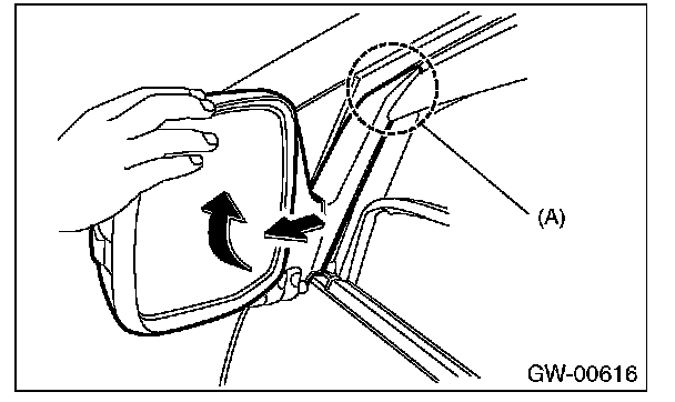 6. Using the upper part (A) of the mirror assembly as a supporting point, pull it upward while drawing the lower part. (Model with door visor)