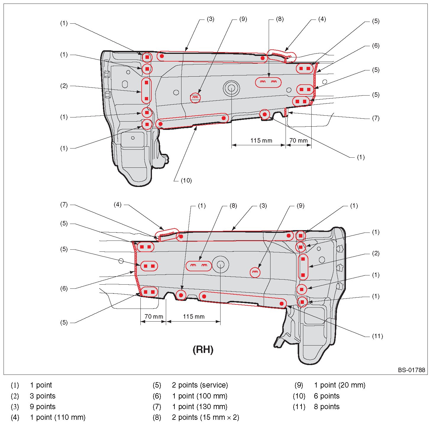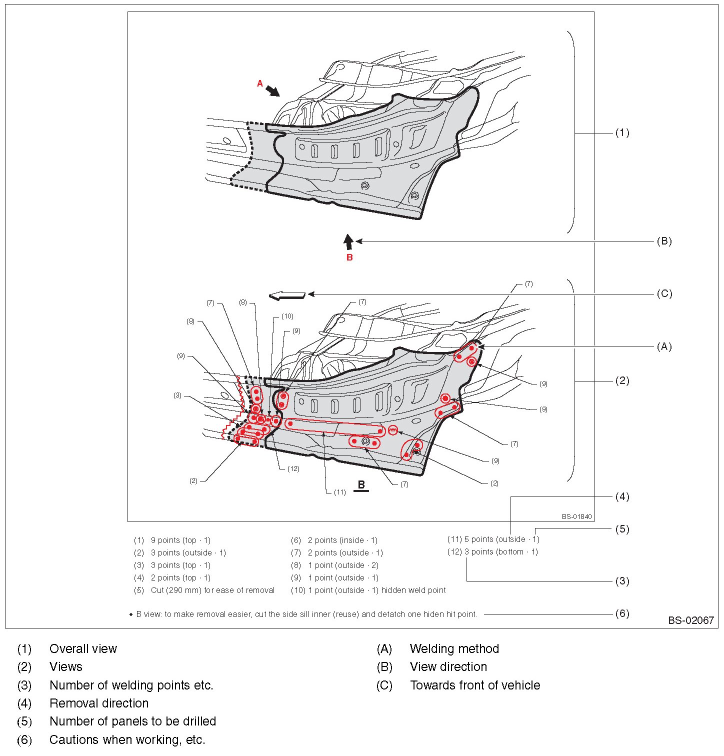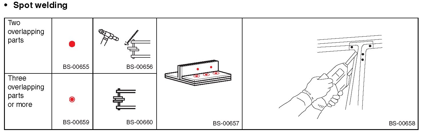 - Symbols and number of points indicate the welding method and the number of welding points. Text in brackets indicate the direction of removal for welded parts, and numbers indicate the number of panels to be drilled to remove welded sections of panels.