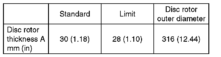 4) Set a micrometer 10 mm (0.39 in) inward from the disc rotor outer perimeter, and then measure the disc rotor thickness. If the thickness of disc rotor exceeds the service limit, replace with a new disc rotor.