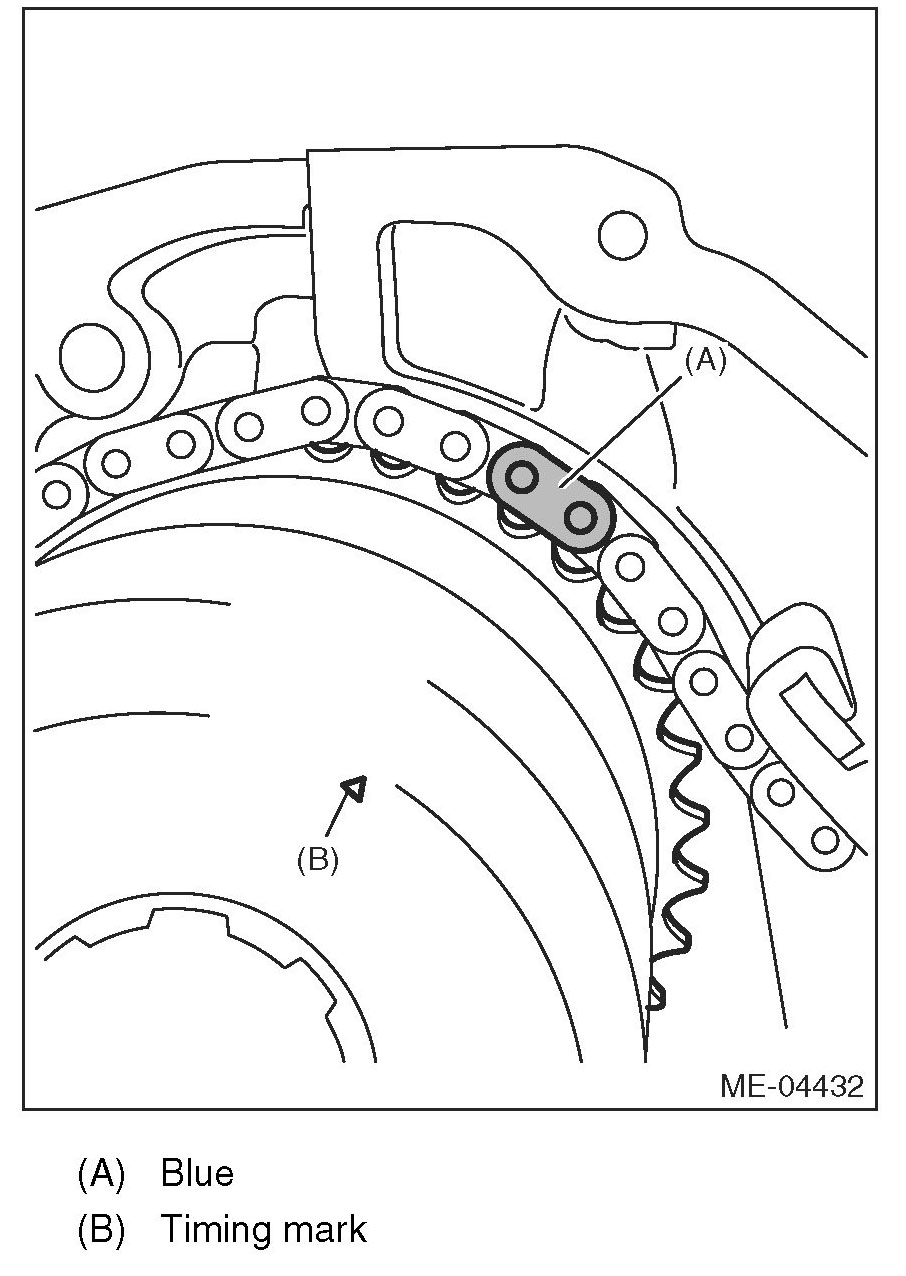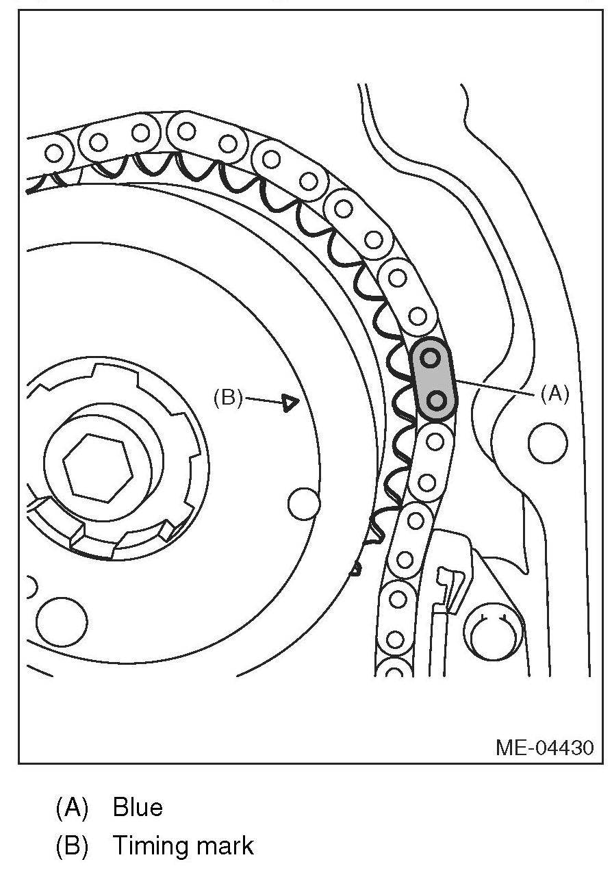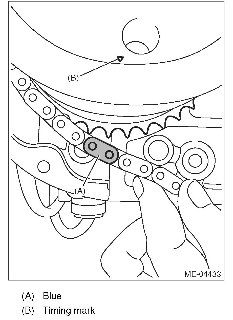 (3) Make sure that the LH side cam sprocket timing mark is aligned to the timing chain mark (blue).