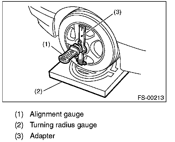 1) Place the front wheel on the turning radius gauge. Make sure the ground contact surfaces of the front and rear wheels are at the same height.