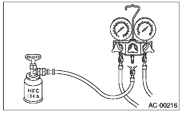 18. If the HFC-134a supply container becomes empty, close all valves, and close the can tap valve to replace the empty container. After replacing with a new HFC-134a supply container, perform air purge, and resume the filling operation.
