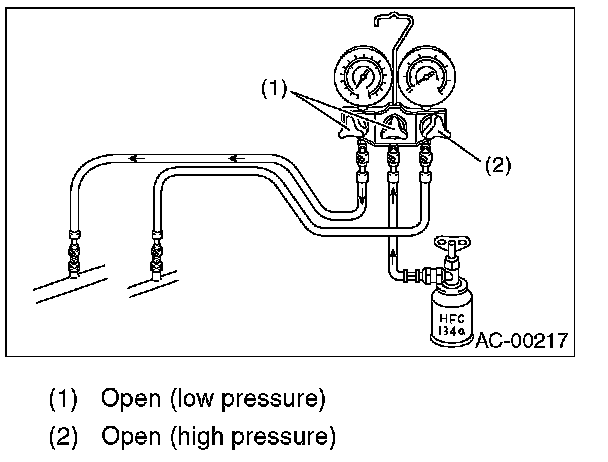 4. Operate the vacuum pump and open the low pressure and high pressure side valves. Next, open the center manifold hose valve, and begin evacuation.