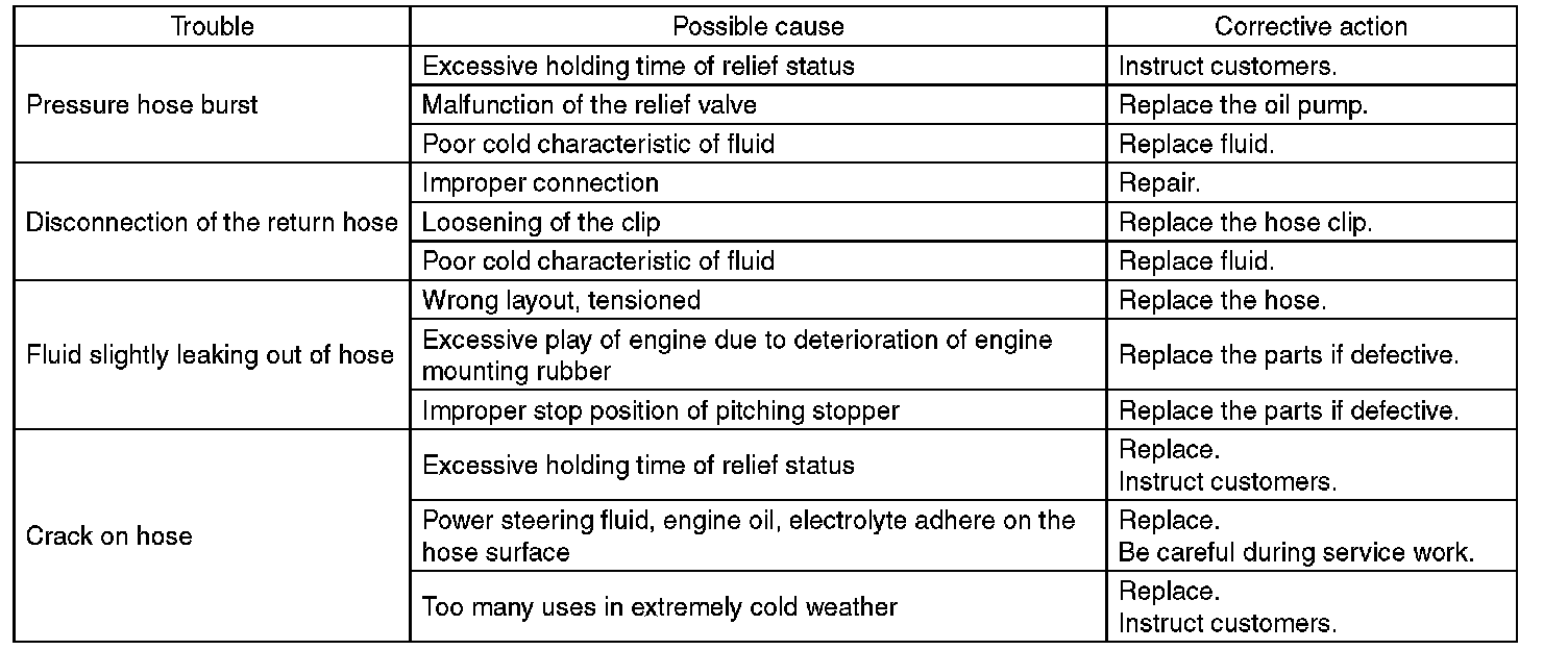 Although the surface layer materials of rubber hoses have excellent weathering resistance, heat resistance and resistance for low temperature brittleness, they are likely to be damaged chemically by brake fluid, battery electrolyte, engine oil and automatic transmission fluid and their service lives are to be very shortened. Wipe off hoses immediately if any of these come into contact with the hoses. Since resistances for heat or low temperature brittleness are gradually declining according to time accumulation of hot or cold conditions for the hoses and their service lives are shortening accordingly, it is necessary to perform careful inspection frequently when the vehicle is used in hot weather areas, cold weather areas and a driving condition in which many steering operations are required in short time.