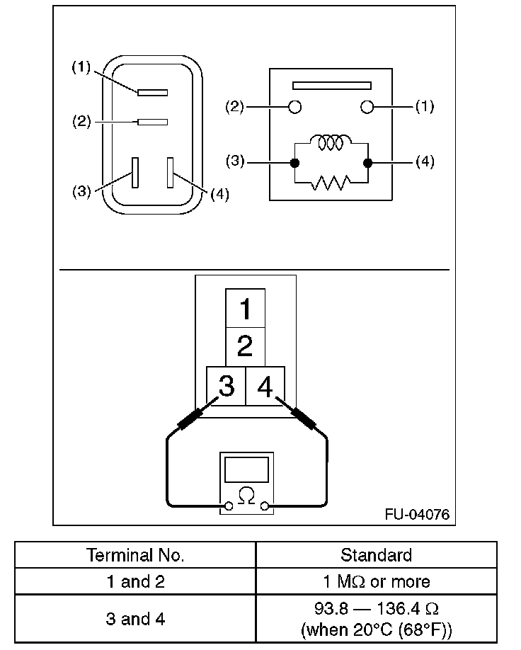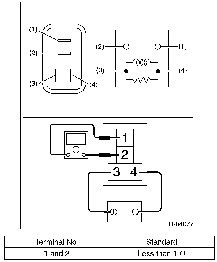 3. Connect battery positive terminal to terminal No. 3 and battery ground terminal to terminal No. 4, and measure the resistance between the electronic throttle control relay terminals.