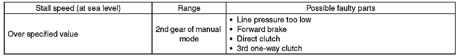 ^ If the stall speed is higher than the specified range, attempt to finish the stall test in as short a time as possible, in order to prevent the automatic transmission from sustaining damage.