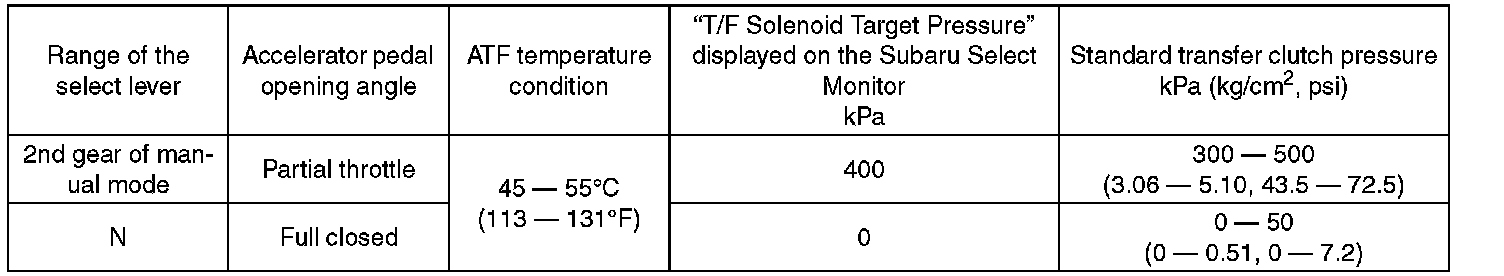 ^ Adjust the accelerator pedal opening angle in order to obtain the "T/F solenoid target pressure" displayed on the Subaru Select Monitor.