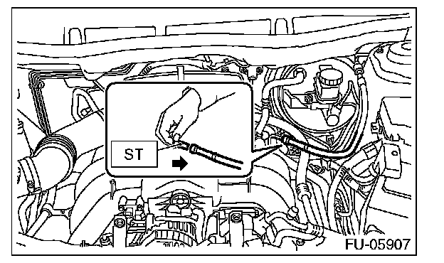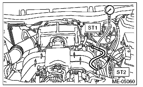 (2) Connect the fuel pressure gauge with ST1 and ST2.