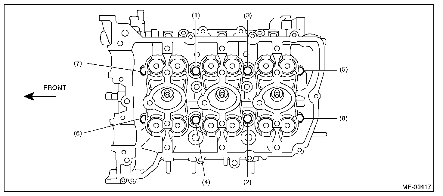 Tighten the bolts (5) - (8) 44 Nm (4.5 kgf-m, 32.5 ft-lb).