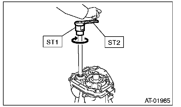 5) Rotate the drive pinion ten times or more using ST1 and ST2.