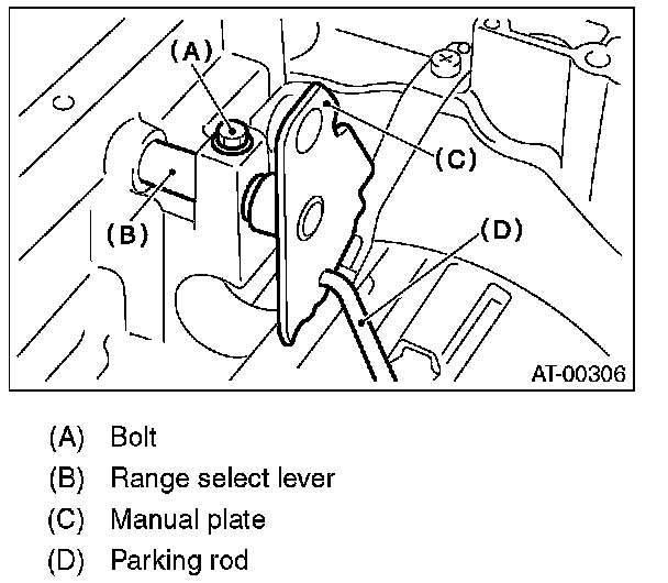 9) Remove the bolts securing range select lever, and then remove the select lever, manual plate and parking rod.