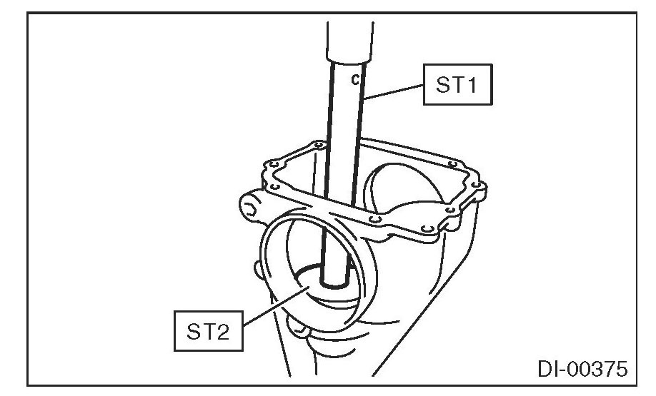 (1) Install the rear bearing race into the differential carrier using ST1 and ST2.