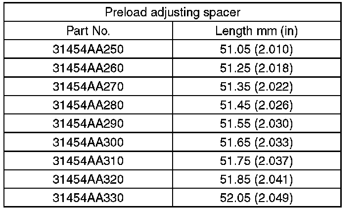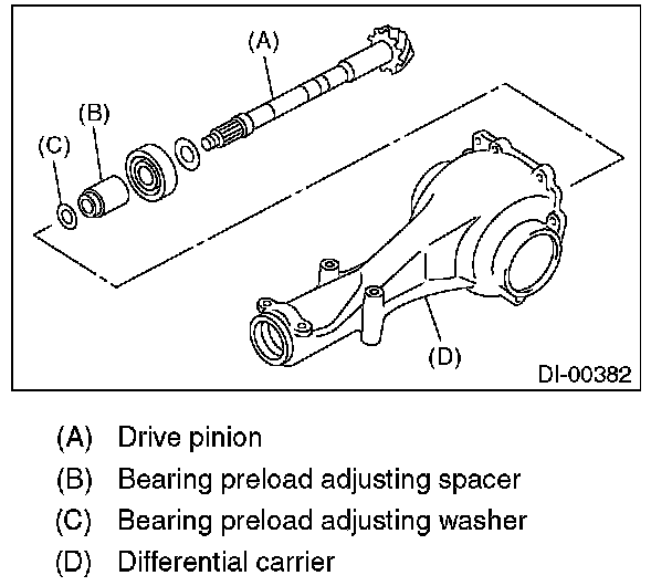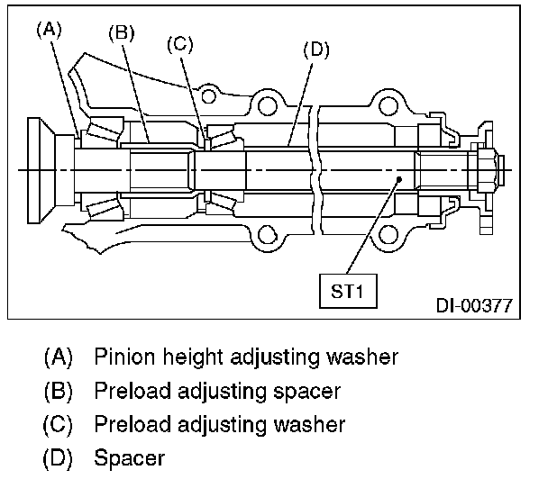 Adjust the bearing preload between front and rear bearings with spacer and washer. Pinion height adjusting washer is not affected by this adjustment. The adjustment must not be carried out with oil seal inserted.
