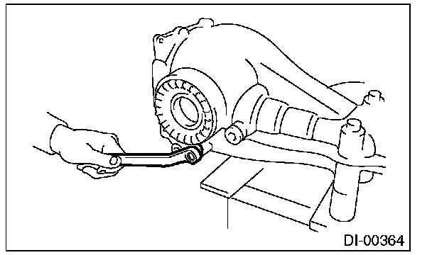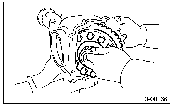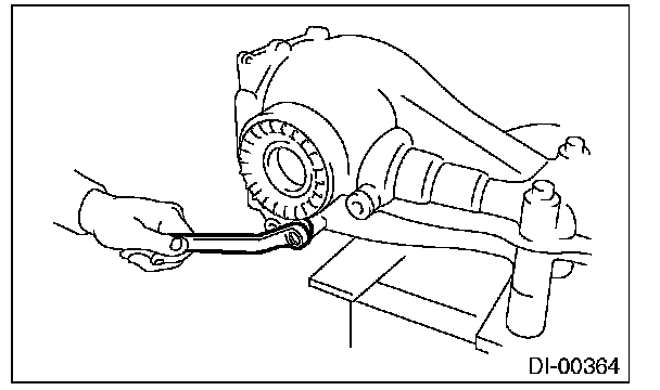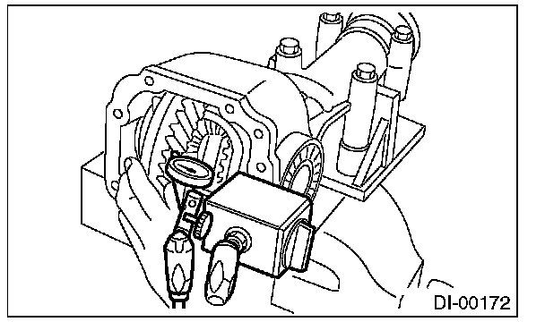 16) Perform the backlash adjustment between the hypoid driven gear and drive pinion, and preload adjustment of differential side bearing.