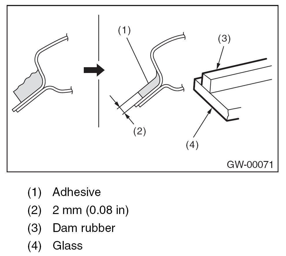 - For minimum drying time and vehicle standing time before driving after bonding, follow instructions or instruction manual from the adhesive manufacturer.