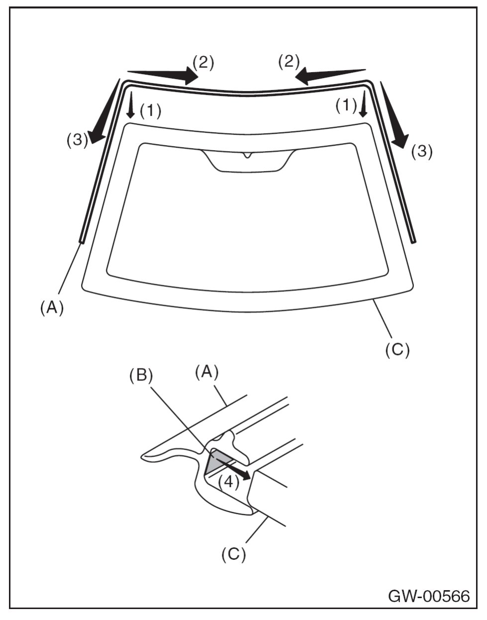 1. Align the molding (A) with both ends of the upper edge of the windshield glass (C).