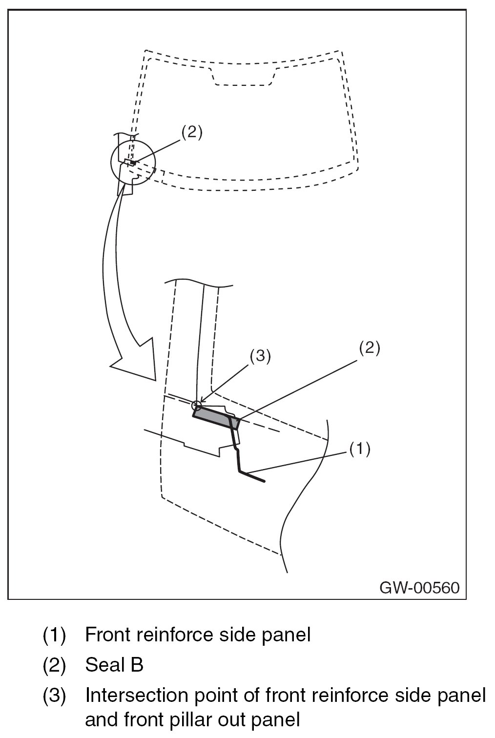 7. Apply the seal B (2) to terminal section of front reinforce side panel (1) and the intersection point (3) of front reinforce side panel and front pillar out panel.