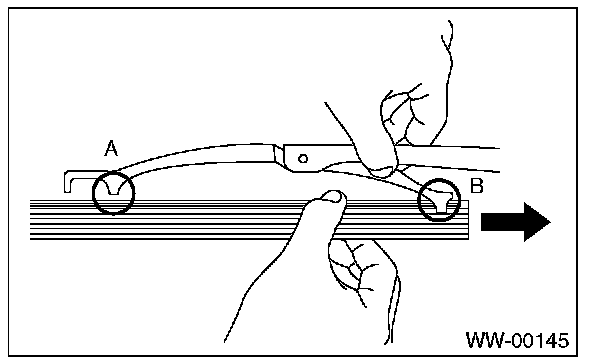 Pull side (A) of the wiper rubber stopper and remove the rubber from the blade assembly.