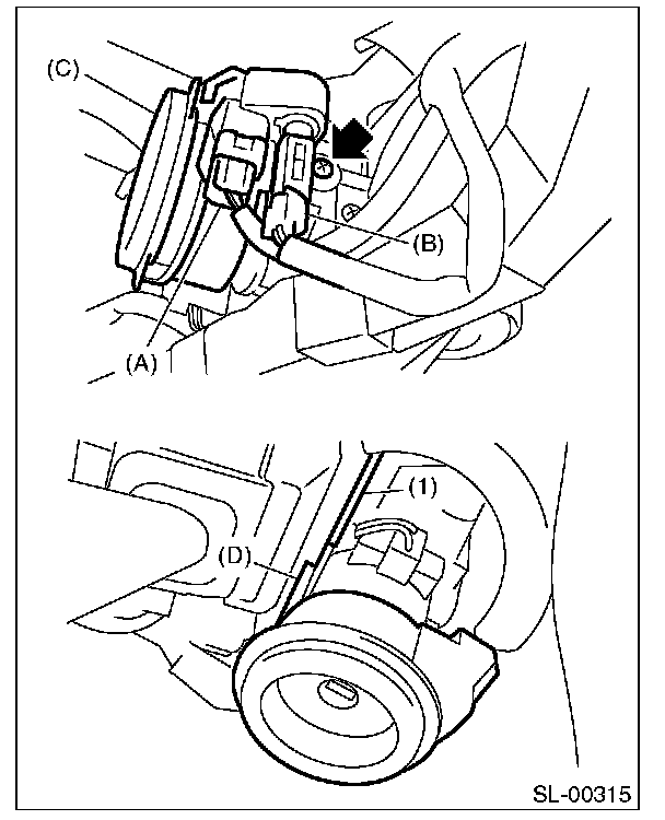 8. Loosen the screw and release the lock (D) at opposite side using flat tip screwdriver (1), and then detach the immobilizer antenna (C).