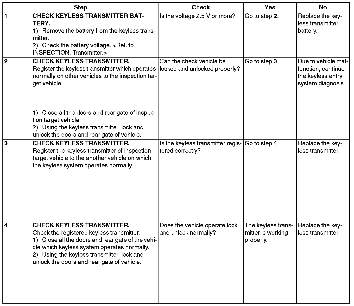 CAUTION: Be sure to reset keyless transmitter of other vehicles registered to the inspection target vehicle, and vehicles to which keyless transmitters were registered for inspection, to the condition before performing the inspection. (Re-register the keyless transmitters.)