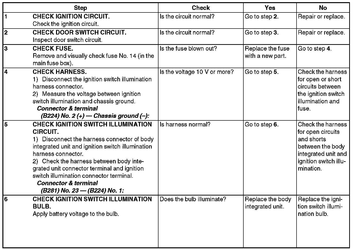 CHECK IGNITION SWITCH ILLUMINATION