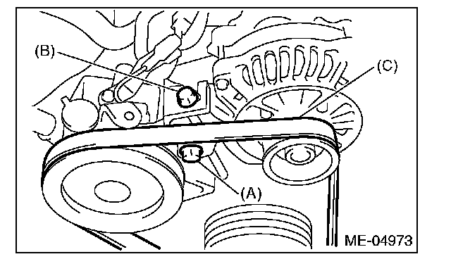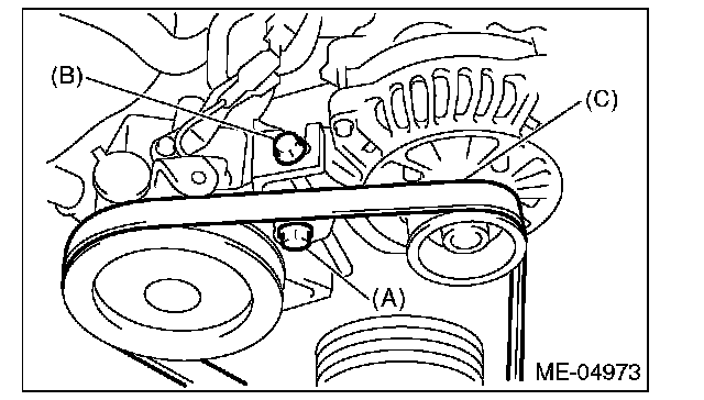 2) Install the front side belt (C), and adjust the slider bolt (B) so as to obtain the specified belt tension.