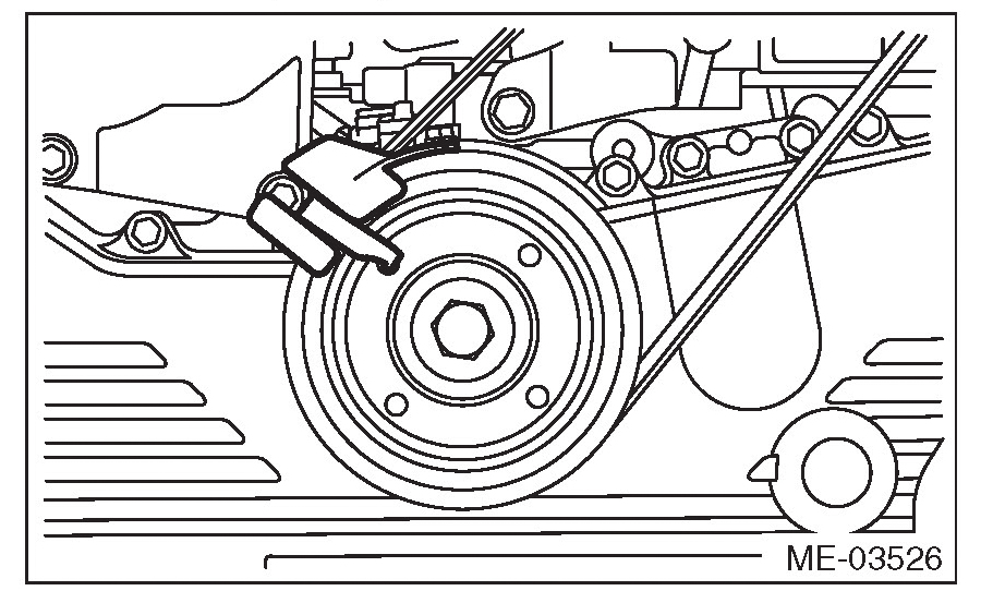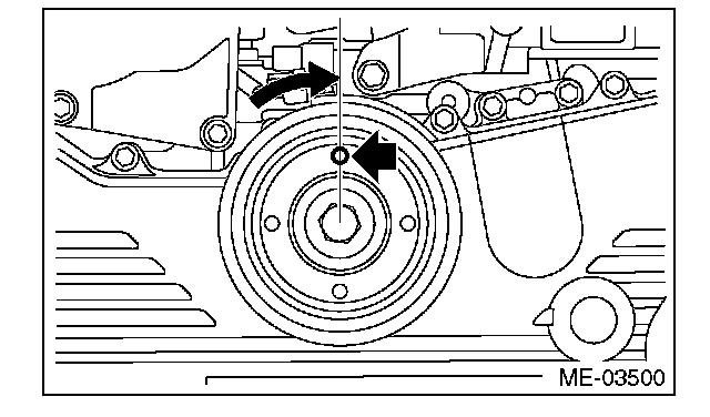 3) Slowly turn the crank pulley clockwise so that the service hole of the crank pulley comes around the top.