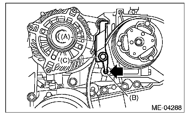 5) As shown in the figure, insert the claw of the belt stopper (A) to the lower hole (B) of the compressor bracket, then attach with bolt (C).