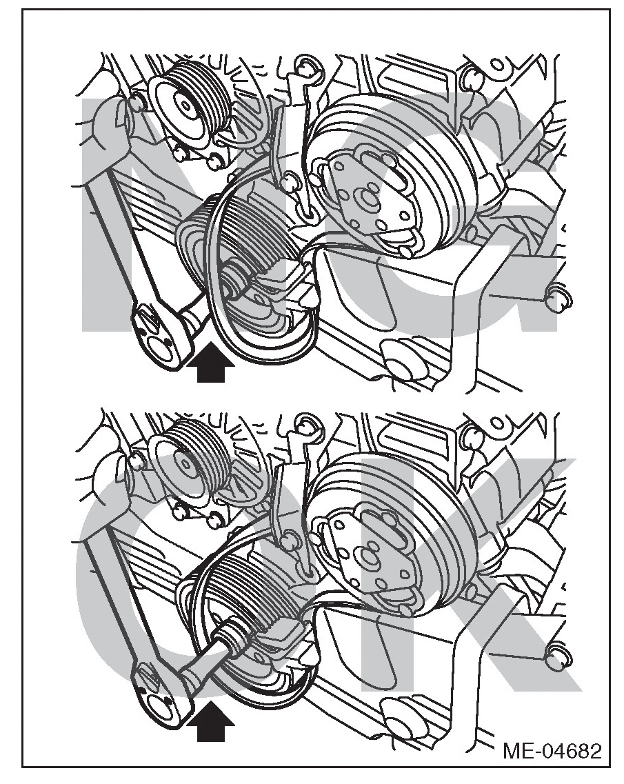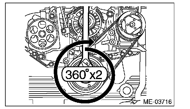 16) Make sure that the belt rib is securely installed on the groove of each pulley, then turn the crank pulley slowly, twice in the clockwise direction, to seat the rear side belt properly.