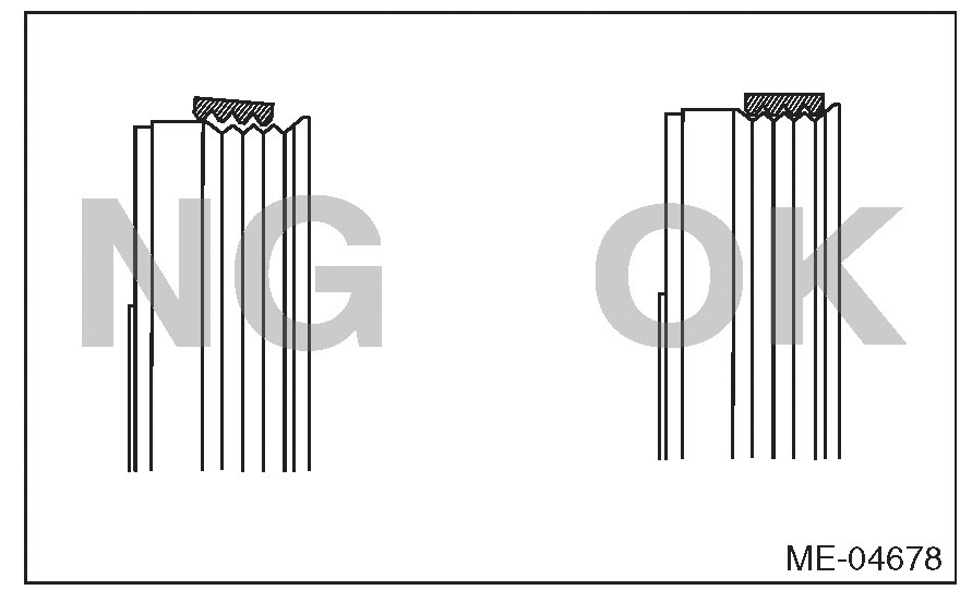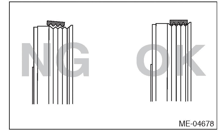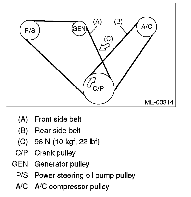 ^ If the front side belt tension is lower, the front side belt and crank pulley slip, causing abnormally high temperature on the crank pulley due to frictional heat. If this condition repeatedly occurs, the front side belt may abnormally wear, causing abnormal noise, front side belt damage or crank pulley damage.