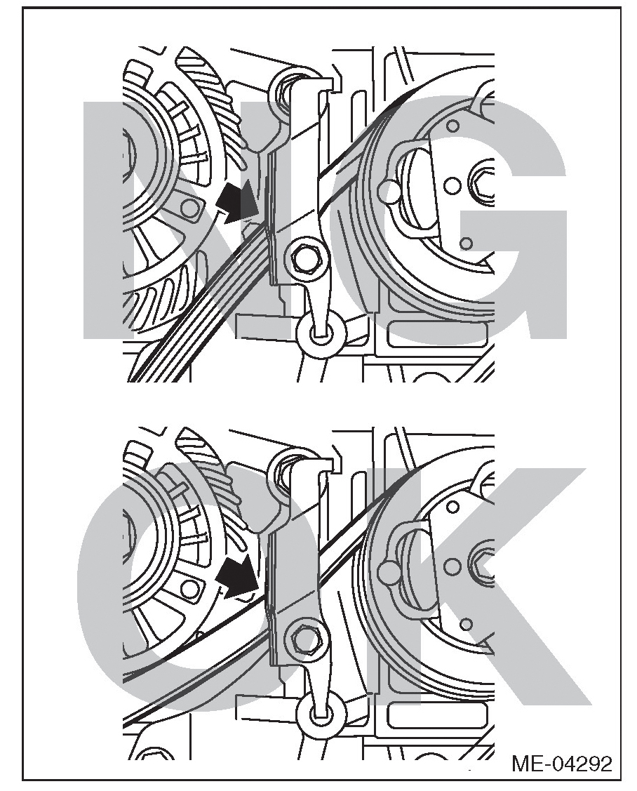 9) Place the rib surface of the rear side belt into the crank pulley groove, so that the rear side belt comes in between the belt guide holder.