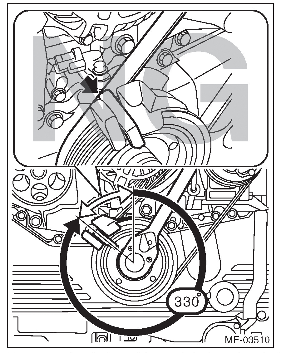 11) While checking the following, slowly turn the crank pulley approximately 90° clockwise so that the belt guide comes to the position shown in the figure.